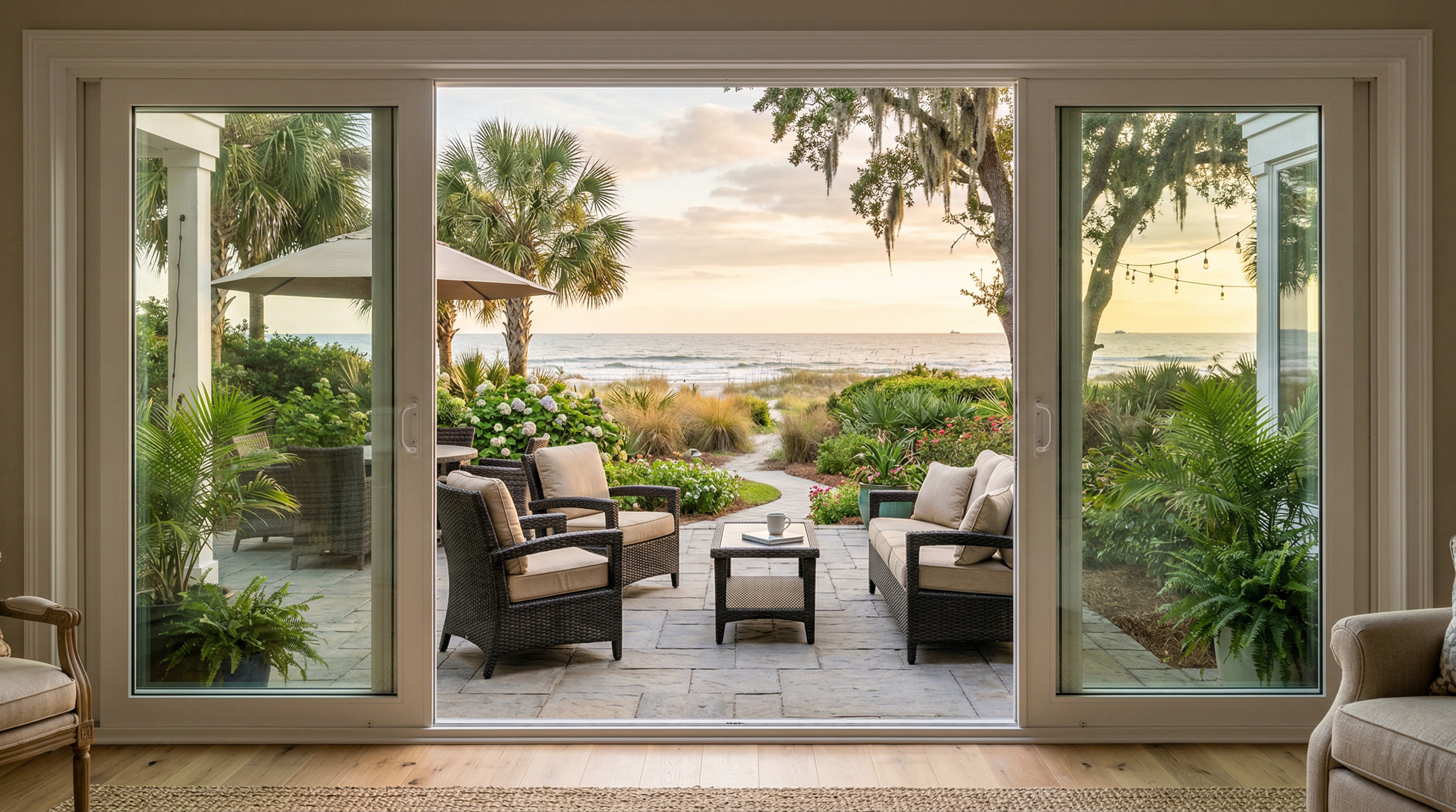 Open your home to the beauty of the Lowcountry. Our sliding patio doors deliver breathtaking views, coastal storm protection, and effortless indoor-outdoor living.