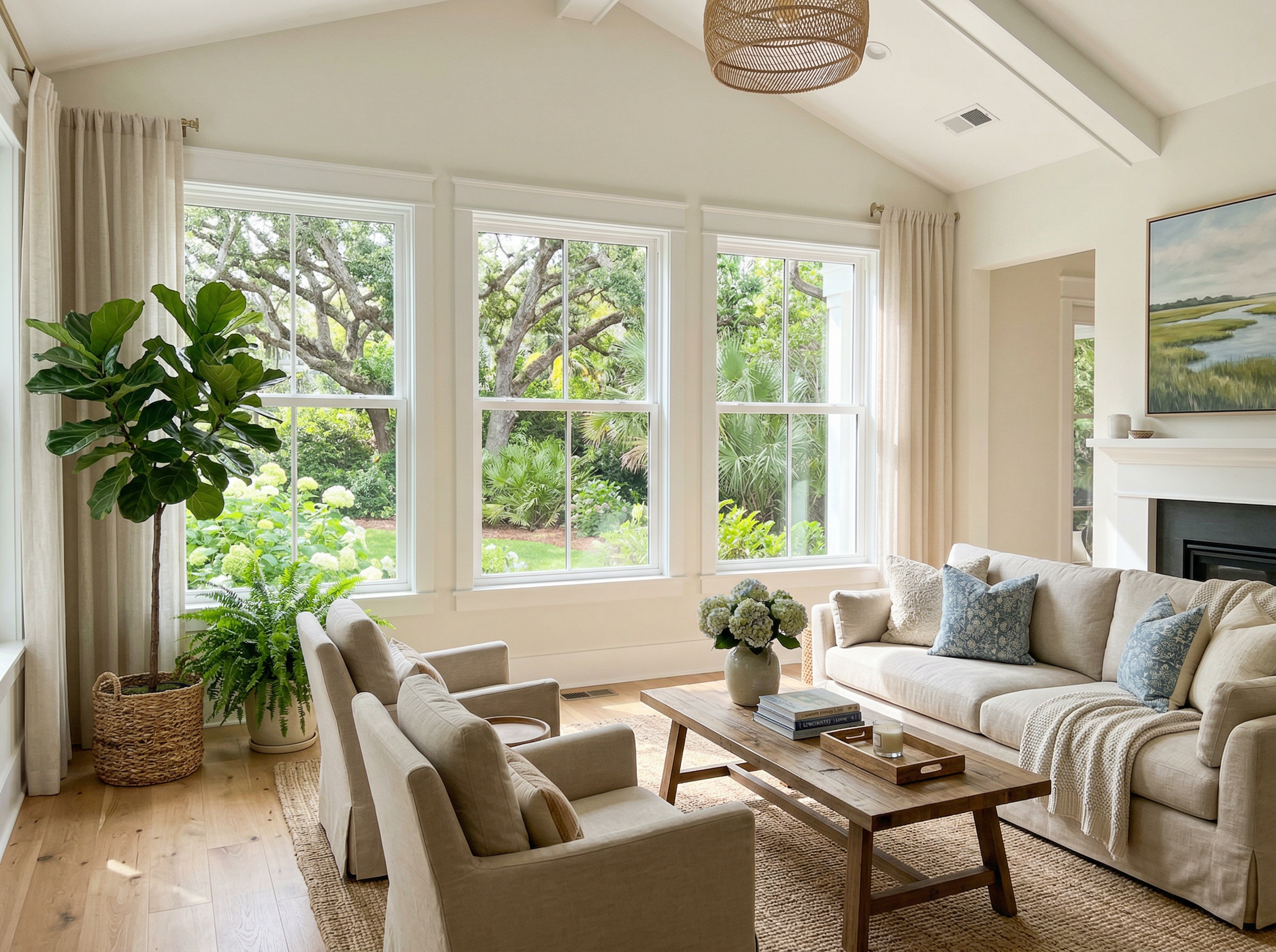 Vinyl windows engineered for the Lowcountry coast. Salt-air resistant, hurricane-rated options, and backed by a lifetime warranty. Locally owned and completed in 1 day.